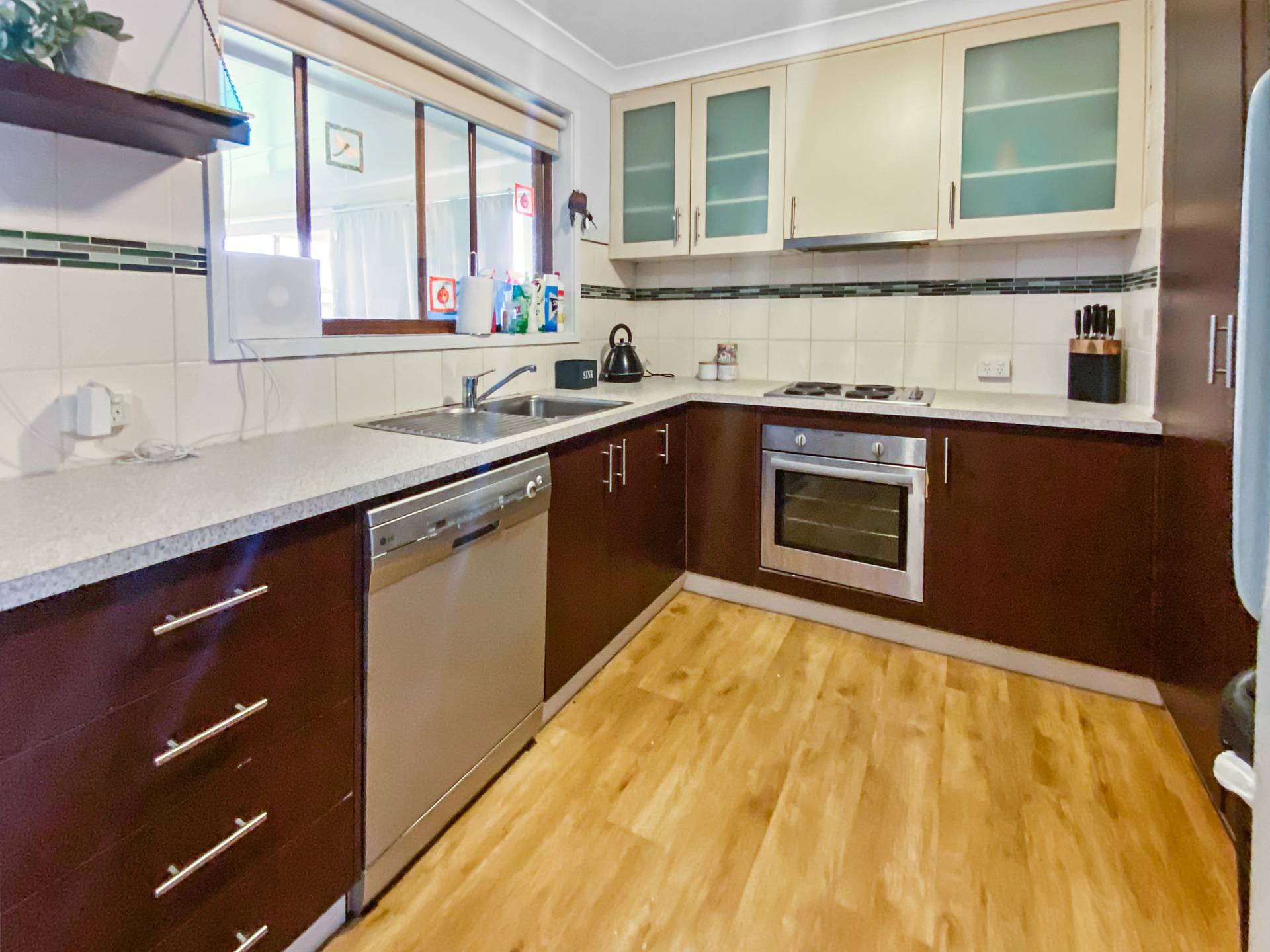 The kitchen has been updated and has stainless steel appliances including dishwasher, 600mm electric cooktop and under bench oven.