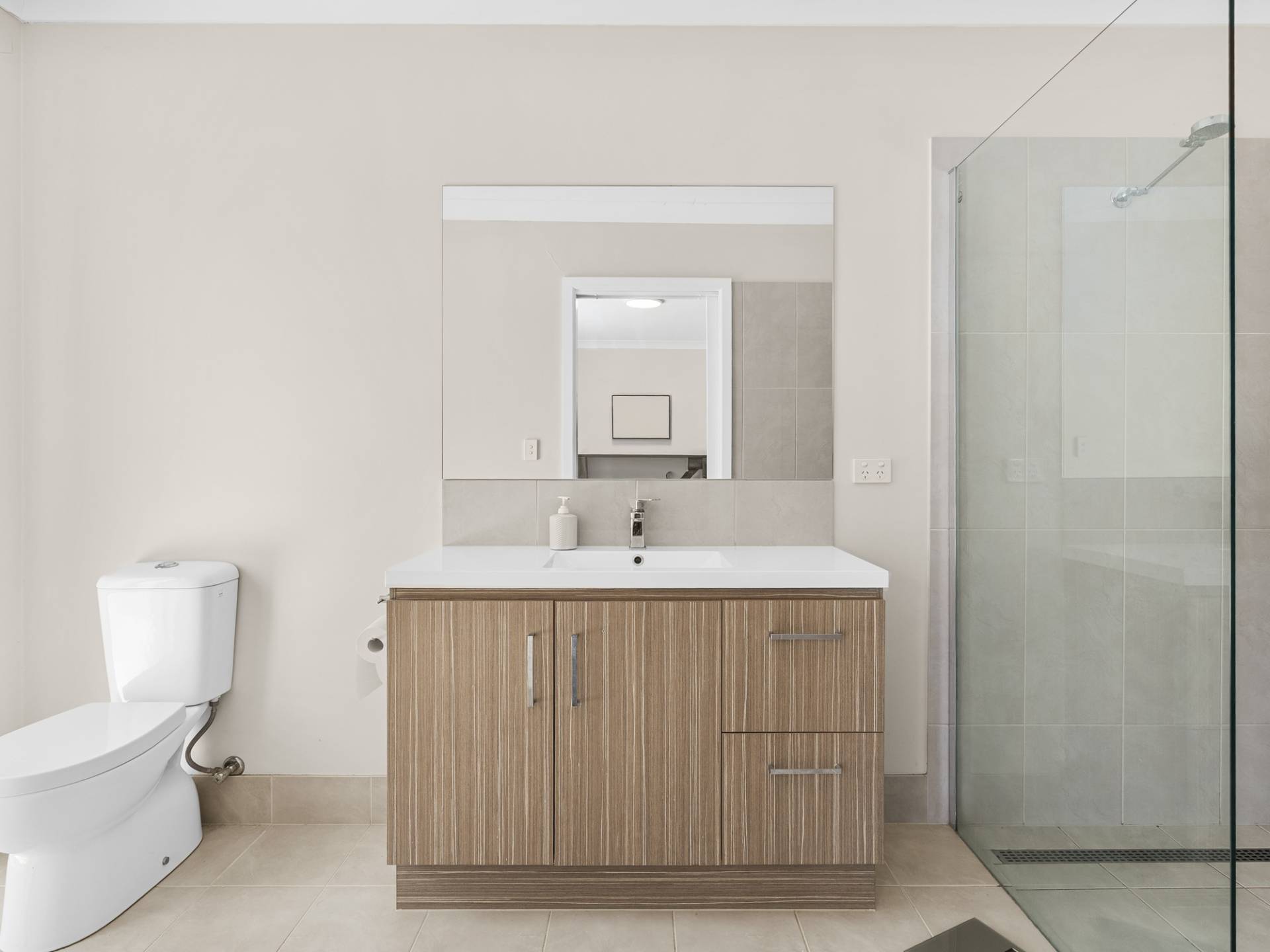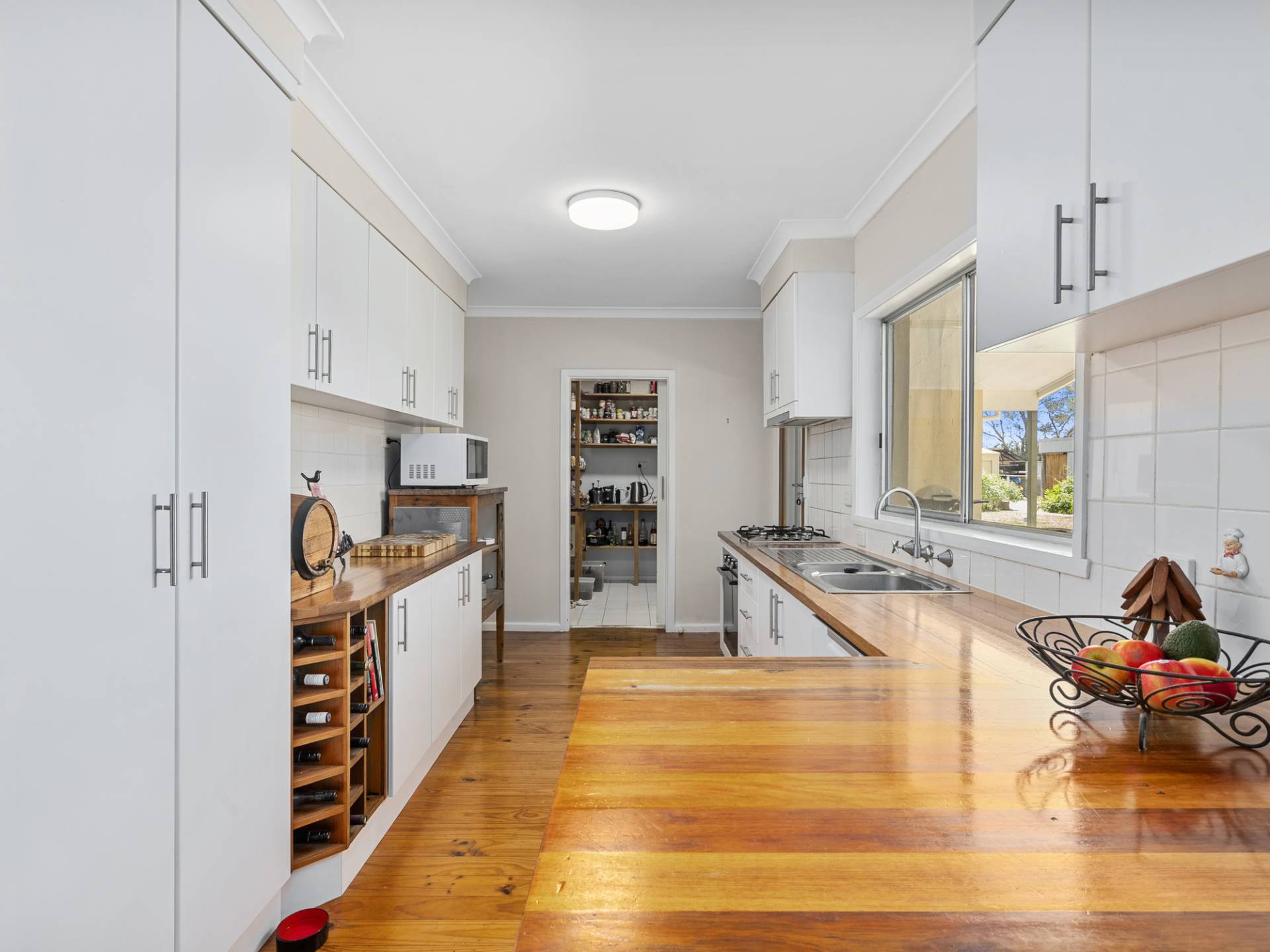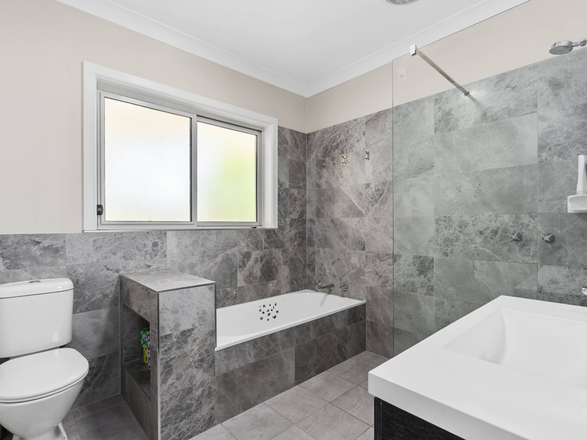 The renovated family bathroom ensures to accommodate the whole family which has a walk in shower, bath, vanity and toilet with the laundry having cupboard storage and bench spacing.